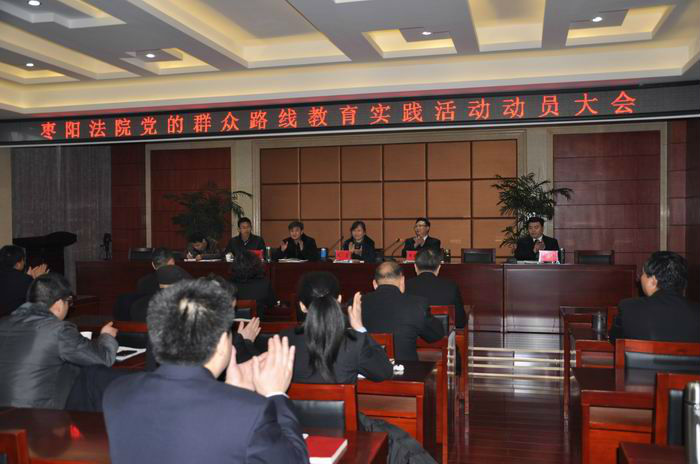 2月26日上午,枣阳法院召开党的群众路线教育实践活动动员大会,对全院深入开展党的群众路线教育实践活动作出动员部署。院党组书记、院长周俊庆作动员讲话,市委第十四督导组成员、市政协副主席毛霞出席并讲话,院党组副书记、副院长唐铸主持会议并宣读了成立我院党的群众路线教育实践活动领导小组的通知及活动方案。全院干警及离退休老干部参加了会议。